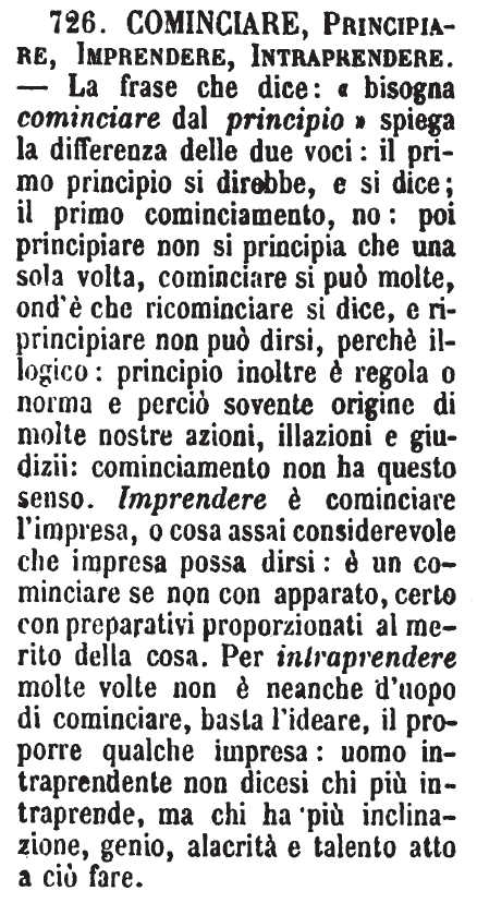 | Cominciare, Principiare, Imprendere, Intraprendere - La frase che dice: «bisogna cominciare dal principio» spiega la differenza delle due voci: il primo principio si direbbe, e si dice; il primo cominciamento, no: poi principiare non si principia che una sola volta, cominciare si può molte, ond'è che ricominciare si dice, e riprincipiare non può dirsi, perchè illogico: principio inoltre è regola o norma e perciò sovente origine di molte nostre azioni, illazioni e giudizii: cominciamento non ha questo senso. Imprendere è cominciare l'impresa, o cosa assai considerevole che impresa possa dirsi: è un cominciare se non con apparato, certo con preparativi proporzionati al merito della cosa. Per intraprendere molte volte non è neanche d'uopo di cominciare, basta l'ideare, il proporre qualche impresa: uomo intraprendente non dicesi chi più intraprende, ma chi ha più inclinazione, genio, alacrità e talento atto a ciò fare. [immagine] |
