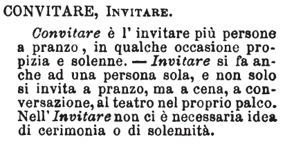 | Convitare, Invitare - Convitare è l'invitare più persone a pranzo, in qualche occasione propizia e solenne. - Invitare si fa anche ad una persona sola, e non solo si invita a pranzo, ma a cena, a conversazione, al teatro nel proprio palco. Nell'Invitare non ci è necessaria idea di cerimonia o di solennità. [immagine] |