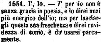 | I’, Io - I' per io non è senza grazia in poesia, e lo direi anzi più energico dell'io; ma per lasciargli questa sua freschezza e direi ruvidezza di conio, è da usarsi parcamente. [immagine] |