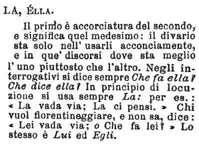 | La, Ella - Il primo è accorciatura del secondo, e significa quel medesimo: il divario sta solo nell'usarli acconciamente, e in que' discorsi dova sta meglio l'uno piuttosto che l'altro. Negli interrogativi si dice sempre Che fa ella? Che dice ella? In principio di locuzione si usa sempre La: per es.: «La vada via; La ci pensi.» Chi vuol fiorentineggiare, e non sa, dice: «Lei vada via; o Che fa lei?» Lo stesso è Lui ed Egli. [immagine] |