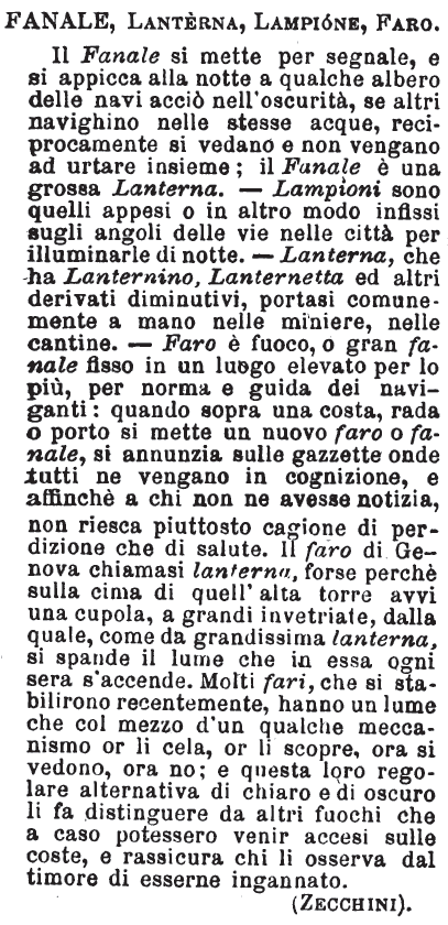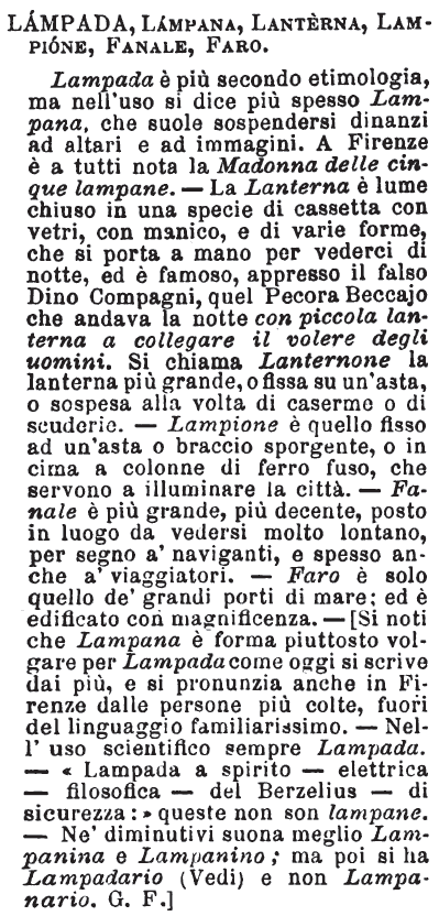| Lampada, Lampana, Lanterna, Lampione, Fanale, Faro - Lampada è più secondo etimologia, ma nell'uso si dice più spesso Lampana, che suole sospendersi dinanzi ad altari e ad immagini. A Firenze è a tutti nota la Madonna delle cinque lampane. - La Lanterna è lume chiuso in una specie di cassetta con vetri, con manico, e di varie forme, che si porta a mano per vederci di notte, ed è famoso, appresso il falso Dino Compagni, quel Pecora Beccajo che andava la notte con piccola lanterna a collegare il volere degli uomini. Si chiama Lanternone la lanterna più grande, o fissa su un'asta, o sospesa alla volta di caserme o di scuderie. - Lampione è quello fisso ad un'asta o braccio sporgente, o in cima a colonne di ferro fuso, che servono a illuminare la città. - Fanale è più grande, più decente, posto in luogo da vedersi molto lontano, per segno a' naviganti, e spesso anche a' viaggiatori. - Faro è solo quello de' grandi porti di mare; ed è edificato con magnificenza. - [Si noti che Lampana è forma piuttosto volgare per Lampada come oggi si scrive dai più, e si pronunzia anche in Firenze dalle persone più colte, fuori del linguaggio familiarissimo. - Nell'uso scientifico sempre Lampada. - «Lampada a spirito - elettrica - filosofica - del Berzelius - di sicurezza:» queste non son lampane. - Ne' diminutivi suona meglio Lampanina e Lampanino; ma poi si ha Lampadario (Vedi) e non Lampanario. G. F.] [immagine] |