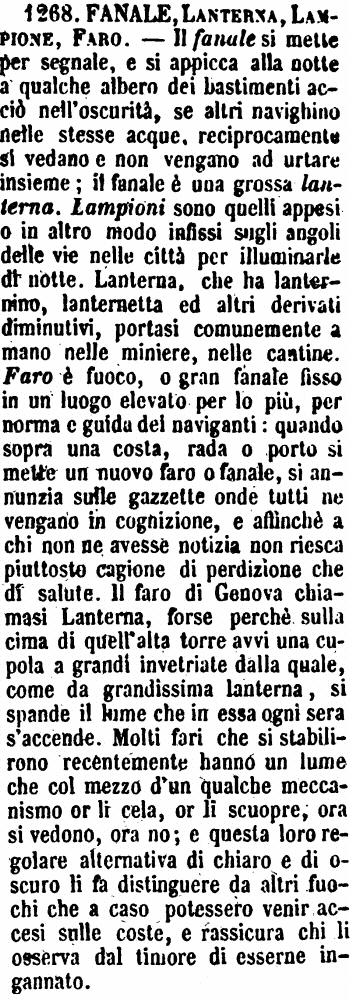 | Fanale, Lanterna, Lampione, Faro - Il fanale si mette per segnale, e si appicca alla notte a qualche albero dei bastimenti acciò nell'oscurità, se altri navighino nelle stesse acque, reciprocamente si vedano e non vengano ad urtare insieme; il fanale è una grossa lanterna. Lampioni sono quelli appesi o in altro modo infissi sugli angoli delle vie nelle città per illuminarle di notte. Lanterna, che ha lanternino, lanternetta ed altri derivati diminutivi, portasi comunemente a mano nelle miniere, nelle cantine. Faro è fuoco, o gran fanale fisso in un luogo elevato per lo più, per norma e guida dei naviganti: quando sopra una costa, rada o porto si mette un nuovo faro o fanale, si annunzia sulle gazzette onde tutti ne vengano in cognizione, e affinchè a chi non ne avesse notizia non riesca piuttosto cagione di perdizione che di salute. Il faro di Genova chiamasi Lanterna, forse perchè sulla cima di quell'alta torre avvi una cupola a grandi invetriate dalla quale, come da grandissima lanterna, si spande il lume che in essa ogni sera s'accende. Molti fari che si stabilirono recentemente hanno un lume che col mezzo d'un qualche meccanismo or li cela, or li scuopre, ora si vedono, ora no; e questa loro regolare alternativa di chiaro e di oscuro li fa distinguere da altri fuochi che a caso potessero venir accesi sulle coste, e rassicura chi li osserva dal timore di esserne ingannato. [immagine] |