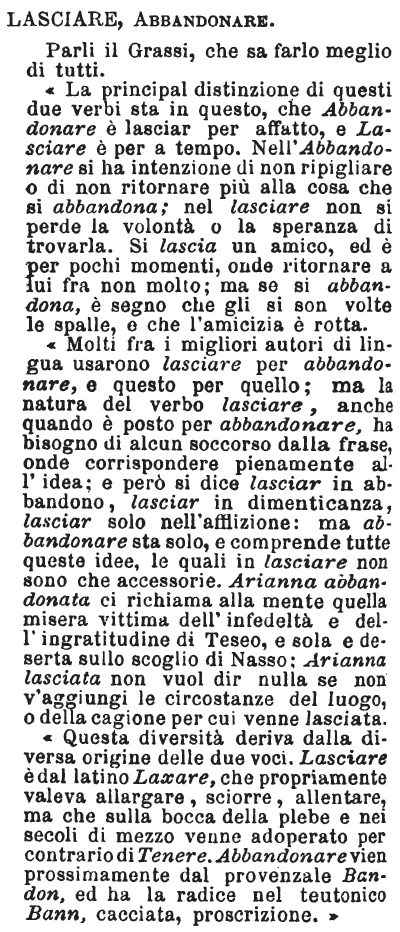 «La principal distinzione di questi due verbi sta in questo, che Abbandonare è lasciar per affatto, e Lasciare è per a tempo. Nell'Abbandonare si ha intenzione di non ripigliare o di non ritornare più alla cosa che si abbandona; nel lasciare non si perde la volontà o la speranza di trovarla. Si lascia un amico, ed è per pochi momenti, onde ritornare a lui fra non molto; ma se si abbandona, è segno che gli si son volte le spalle, e che l'amicizia è rotta.