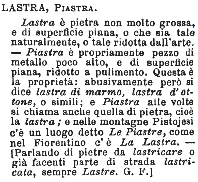 | Lastra, Piastra - Lastra è pietra non molto grossa, e di superficie piana, o che sia tale naturalmente, o tale ridotta dall'arte. - Piastra è propriamente pezzo di metallo poco alto, e di superficie piana, ridotto a pulimento. Questa è la proprietà: abusivamente però si dice lastra di marmo, lastra d'ottone, o simili; e Piastra alle volte si chiama anche quella di pietra, cioè la lastra; e nelle montagne Pistojesi c'è un luogo detto Le Piastre, come nel Fiorentino c'è La Lastra. - [Parlando di pietre da lastricare o già facenti parte di strada lastricata, sempre Lastre. G. F.] [immagine] |