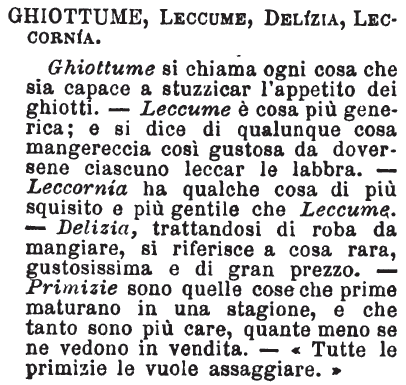 | Ghiottume, Leccume, Delizia, Leccornia - Ghiottume si chiama ogni cosa che sia capace a stuzzicar l'appetito dei ghiotti. - Leccume è cosa più generica; e si dice di qualunque cosa mangereccia così gustosa da doversene ciascuno leccar le labbra. - Leccornia ha qualche cosa di più squisito e più gentile che Leccume. - Delizia, trattandosi di roba da mangiare, si riferisce a cosa rara, gustosissima e di gran prezzo. - Primizie sono quelle cose che prime maturano in una stagione, e che tanto sono più care, quante meno se ne vedono in vendita. - «Tutte le primizie le vuole assaggiare.» [immagine] |