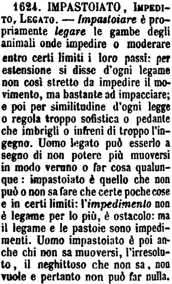 | Impastoiato, Impedito, Legato - Impastoiare è propriamente legare le gambe degli animali onde impedire o moderare entro certi limiti i loro passi: per estensione si disse d'ogni legame non così stretto da impedire il movimento, ma bastante ad impacciare; e poi per similitudine d'ogni legge o regola troppo sofistica o pedante che imbrigli o infreni di troppo l'ingegno. Uomo legato può esserlo a segno di non potere più muoversi in modo veruno o far cosa qualunque: impastoiato è quello che non può e non sa fare che certe poche cose e in certi limiti: l'impedimento non è legame per lo più, è ostacolo: ma il legame e le pastoie sono impedimenti. Uomo impastoiato è poi anche chi non sa muoversi, l'irresoluto, il neghittoso che non sa, non vuole e pertanto non può far nulla. [immagine] |