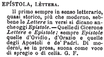 | Epistola, Lettera - Il primo sempre in senso letterario, quasi storico, più che moderno, sebbene le Lettere in versi si dicano anche oggi Epistole. - Quelle di Cicerone Lettere e Epistole; sempre Epistole quelle d'Ovidio, d'Orazio e quelle degli Apostoli e de' Padri. Di moderni, se in prosa, suona come voce di spregio o di celia. G. F. [immagine] |