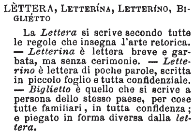 | Lettera, Letterina, Letterino, Biglietto - La Lettera si scrive secondo tutte le regole che insegna l'arte retorica. - Letterina è lettera breve e garbata, ma senza cerimonie. - Letterino è lettera di poche parole, scritta in piccolo foglio e tutta confidenziale. - Biglietto è quello che si scrive a persona dello stesso paese, per cose tutte familiari, in tutta confidenza; e piegato in forma diversa dalla lettera. [immagine] |