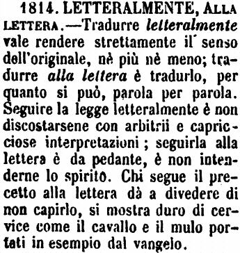 | Letteralmente, Alla lettera - Tradurre letteralmente vale rendere strettamente il senso dell'originale, nè più nè meno; tradurre alla lettera è tradurlo, per quanto si può, parola per parola. Seguire la legge letteralmente è non discostarsene con arbitrii e capricciose interpretazioni; seguirla alla lettera è da pedante, è non intenderne lo spirito. Chi segue il precetto alla lettera dà a divedere di non capirlo, si mostra duro di cervice come il cavallo e il mulo portati in esempio dal vangelo. [immagine] |
