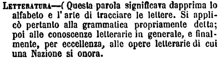 | Letteratura - Questa parola significava dapprima lo alfabeto e l'arte di tracciare le lettere. Si applicò pertanto alla grammatica propriamente detta; poi alle conoscenze letterarie in generale, e finalmente, per eccellenza, alle opere letterarie di cui una Nazione si onora. [immagine] |