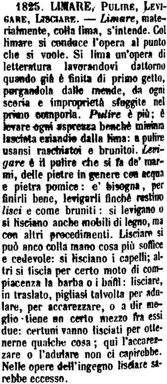 | Limare, Pulire, Levigare, Lisciare - Limare, materialmente, colla lima, s'intende. Col limare si conduce l'opera al punto che si vuole. Si lima un'opera di letteratura lavorandovi dattorno quando già è finita di primo getto, purgandola dalle mende, da ogni scoria e improprietà sfuggite nel primo comporla. Pulire è più; è levare ogni asprezza benchè minima lasciata eziandio dalla lima: a pulire usansi raschiatoi e brunitoi. Levigare è il pulire che si fa de' marmi, delle pietre in genere con acqua e pietra pomice: e' bisogna, per finirli bene, levigarli finchè restino lisci e come bruniti: si levigano o si lisciano anche mobili di legno, ma con altri procedimenti. Lisciare si può anco colla mano cosa più soffice e cedevole: si lisciano i capelli; altri si liscia per certo moto di compiacenza la barba o i baffi: lisciare, in traslato, pigliasi talvolta per adulare, per accarezzare, o a dir meglio tiene un certo mezzo fra essi due: certuni vanno lisciati per ottenerne qualche cosa; qui l'accarezzare o l'adulare non ci capirebbe. Nelle opere dell'ingegno lisciare sarebbe eccesso. [immagine] |