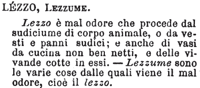 | Lezzo, Lezzume - Lezzo è mal odore che procede dal sudiciume di corpo animale, o da vesti e panni sudici; e anche di vasi da cucina non ben netti, e delle vivande cotte in essi. - Lezzume sono le varie cose dalle quali viene il mal odore, cioè il lezzo. [immagine] |