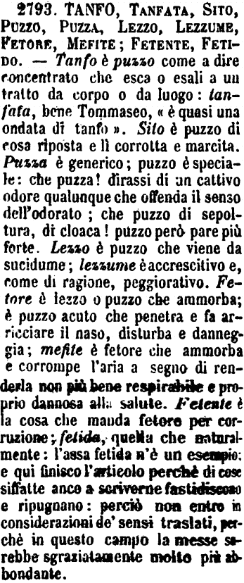 | Tanfo, Tanfata, Sito, Puzzo, Puzza, Lezzo, Lezzume, Fetore, Mefite; Fetente, Fetido - Tanfo è puzzo come a dire concentrato che esca o esali a un tratto da corpo o da luogo: tanfata, bene Tommaseo, « è quasi una ondata di tanfo ». Sito è puzzo di cosa riposta e lì corrotta e marcita. Puzza è generico; puzzo è speciale: che puzza! dirassi di un cattivo odore qualunque che offenda il senso dell'odorato; che puzzo di sepoltura, di cloaca! puzzo però pare più forte. Lezzo è puzzo che viene da sucidume; lezzume è accrescitivo e, come di ragione, peggiorativo. Fetore è lezzo o puzzo che ammorba; è puzzo acuto che penetra e fa arricciare il naso, disturba e danneggia; mefite è fetore che ammorba e corrompe l'aria a segno di renderla non più bene respirabile e proprio dannosa alla salute. Fetente è la cosa che manda fetore per corruzione; fetida, quella che naturalmente: l'assa fetida n'è un esempio; e qui finisco l'articolo perchè di cose siffatte anco a scriverne fastidiscono e ripugnano: perciò non entro in considerazioni de' sensi traslati, perchè in questo campo la messe sarebbe sgraziatamente molto più abbondante. [immagine] |