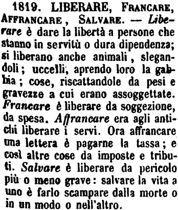 | Liberare, Francare, Affrancare, Salvare - Liberare è dare la libertà a persone che stanno in servitù o dura dipendenza; si liberano anche animali, slegandoli; uccelli, aprendo loro la gabbia; cose, riscattandole da pesi e gravezze a cui erano assoggettate. Francare è liberare da soggezione, da spesa. Affrancare era agli antichi liberare i servi. Ora affrancare una lettera è pagarne la tassa; e così altre cose da imposte e tributi. Salvare è liberare da pericolo più o meno grave: salvare la vita a uno è farlo scampare dalla morte o in un modo o nell'altro. [immagine] |