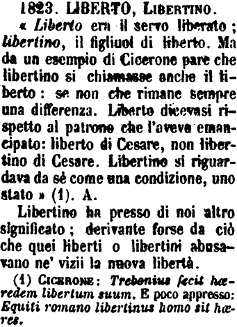 Liberto, Libertino - «Liberto era il servo liberato; libertino, il figliuol di liberto. Ma da un esempio di Cicerone pare che libertino si chiamasse anche il liberto: se non che rimane sempre una differenza. Liberto dicevasi rispetto al patrono che l'aveva emancipato: liberto di Cesare, non libertino di Cesare. Libertino si riguardava da sè come una condizione, uno stato» (1). A.
