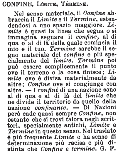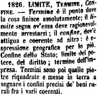 | Limite, Termine, Confine - Termine è il punto dove la cosa finisce assolutamente; il limite segna ov'essa deve ragionevolmente arrestarsi; il confine, dov'è attigua e coerente ad altra: è espressione geografica per lo più. Confine dello Stato; limite del potere, del diritto; termine dell'impresa. Termini sono poi quelle pietre riquadrate e messe in terra a segnare i confini precisi de' beni rurali fra i varii coerenti. [immagine] |