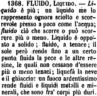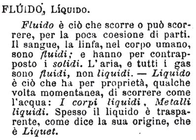 | Fluido, Liquido - Fluido è ciò che scorre o può scorrere, per la poca coesione di parti. Il sangue, la linfa, nel corpo umano, sono fluidi; e hanno per contrapposto i solidi. L'aria, e tutti i gas sono fluidi, non liquidi. - Liquido è ciò che ha per proprietà, qualche volta momentanea, di scorrere come l'acqua: I corpi liquidi, Metalli liquidi. Spesso il liquido è trasparente, come dice la sua origine, che è Liquet. [immagine] |