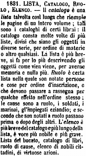 | Lista, Catalogo, Ruolo, Elenco - Il catalogo è una lista talvolta così lunga che riempie le pagine di un intero volume; tali sono i cataloghi di certi librai: il catalogo consta molte volte di più liste, divisi che siano gli oggetti in diverse serie, per ordine di materie o altro qualsiasi. La lista è più breve, si fa per lo più descrivendo gli oggetti come vien viene, per averne memoria e nulla più. Ruolo è certa lista nella quale son notate persone e cose per ordine d'inscrizione, e che devono passare a rassegna per qualche effetto nell'ordine stesso; le cause sono a ruolo, i soldati, i marinai, gl'impiegati eziandio; e secondo che son notati a ruolo passano prima o dopo degli altri. L'elenco è più breve del catalogo e più lungo della lista, è voce più nobile e più grave. Lista del bucato, catalogo di libri, ruolo di cause, elenco di nobili cittadini, di virtuose azioni. [immagine] |