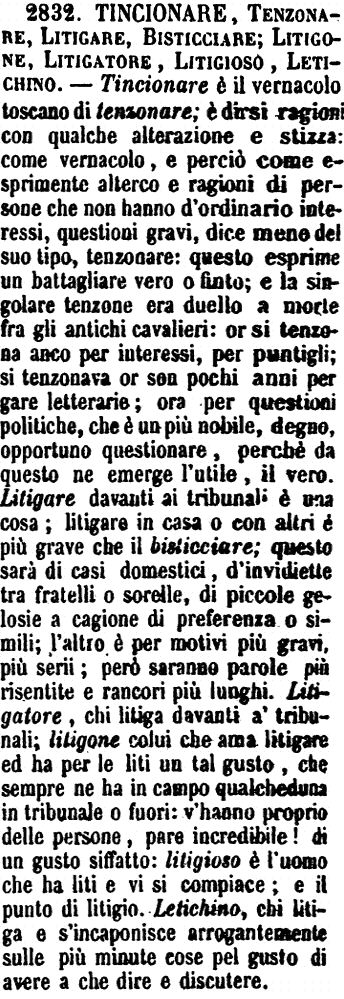 | Tincionare, Tenzonare, Litigare, Bisticciare; Litigone, Litigatore, Litigioso, Letichino - Tincionare è il vernacolo toscano di tenzonare; è dirsi ragioni con qualche alterazione e stizza: come vernacolo, e perciò come esprimente alterco e ragioni di persone che non hanno d'ordinario interessi, questioni gravi, dice meno del suo tipo, tenzonare: questo esprime un battagliare vero o finto; e la singolare tenzone era duello a morte fra gli antichi cavalieri: or si tenzona anco per interessi, per puntigli; si tenzonava or son pochi anni per gare letterarie; ora per questioni politiche, che è un più nobile, degno, opportuno questionare, perchè da questo ne emerge l'utile, il vero. Litigare davanti ai tribunali è una cosa; litigare in casa o con altri è più grave che il bisticciare; questo sarà di casi domestici, d'invidiette tra fratelli o sorelle, di piccole gelosie a cagione di preferenza o simili; l'altro è per motivi più gravi, più serii; però saranno parole più risentite e rancori più lunghi. Litigatore, chi litiga davanti a' tribunali; litigone colui che ama litigare ed ha per le liti un tal gusto, che sempre ne ha in campo qualcheduna in tribunale o fuori: v'hanno proprio delle persone, pare incredibile! di un gusto siffatto: litigioso è l'uomo che ha liti e vi si compiace; e il punto di litigio. Letichino, chi litiga e s'incaponisce arrogantemente sulle più minute cose pel gusto di avere a che dire e discutere. [immagine] |