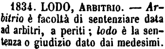 | Lodo, Arbitrio - Arbitrio è facoltà di sentenziare data ad arbitri, a periti; lodo è la sentenza o giudizio dato dai medesimi. [immagine] |