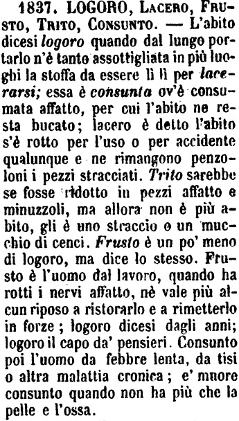 | Logoro, Lacero, Frusto, Trito, Consunto, Mostrar le corde - L'abito dicesi Logoro quando dal lungo portarlo n'è tanto assottigliata in più luoghi la stoffa da essere lì lì per lacerarsi: essa è Consunta ov'è consumata affatto, per cui l'abito ne resta bucato. Lacero è detto l'abito s'è rotto per l'uso o per accidente qualunque e ne rimangono pendenti i pezzi stracciati. - Trito sarebbe se fosse ridotto in pezzi affatto e in minuzzoli, ma allora non è più abito, è uno straccio o un mucchio di cenci. - Frusto è un po' meno di logoro, ma dice lo stesso. Frusto è l'uomo dal lavoro, quando ha rotti i nervi affatto, nè vale più alcun riposo a ristorarlo e a rimetterlo in forze; logoro dicesi dagli anni; logoro il capo da' pensieri. Consunto poi l'uomo da febbre lenta, da tisi o altra malattia cronica: e' muore consunto quando non ha più che pelle e l'ossa. - [Trito si dice in senso affine a Logoro di vestito dal quale si veda la miseria di chi lo porta, e si usa riferito anche alla persona stessa.