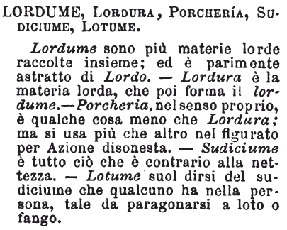 | Lordume, Lordura, Porcheria, Sudiciume, Lotume - Lordume sono più materie lorde raccolte insieme; ed è parimente astratto di Lordo. - Lordura è la materia lorda, che poi forma il lordume. - Porcheria, nel senso proprio, è qualche cosa meno che Lordura; ma si usa più che altro nel figurato per Azione disonesta. - Sudiciume è tutto ciò che è contrario alla nettezza. - Lotume suol dirsi del sudiciume che qualcuno ha nella persona, tale da paragonarsi a loto o fango. [immagine] |