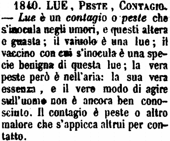 | Lue, Peste, Contagio - Lue è un contagio o peste che s'inocula negli umori, e questi altera e guasta; il vaiuolo è una lue; il vaccino con cui s'inocula è una specie benigna di questa lue; la vera peste però è nell'aria: la sua vera essenza, e il vero modo di agire sull'uomo non è ancora ben conosciuto. Il contagio è peste o altro malore che s'appicca altrui per contatto. [immagine] |