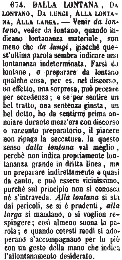 | Dalla lontana, Da lontano, Da lungi, Alla lontana, Alla larga - Venir da lontano, veder da lontano, quando indicano lontananza materiale, son meno che da lungi, giacchè quest'ultima parola sembra indicare una lontananza indeterminata. Farsi da lontano, o preparare da lontano qualche cosa, per es. nel discorso, un effetto, una sorpresa, può peccare per eccedenza; e se per sentire un bel tratto, una sentenza giusta, un bel detto, ho da sentirmi prima annoiare durante mezz'ora con discorso o racconto preparatorio, il piacere non ripaga la seccatura. In questo senso dalla lontana val meglio, perchè non indica propriamente lontananza grande in dritta linea, ma un preparare indirettamente e quasi da canto, e può essere vicinissimo, purchè sul principio non si conosca nè s'intraveda. Alla lontana si sta dai pericoli, se si è prudenti, alla larga si mandano, o si voglion respingere; così almeno suona la parola; e quando cotesti modi si adoperano s'accompagnano per lo più con un gesto della mano che indica l'allontanamento desiderato. [immagine] |