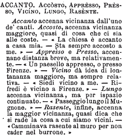 | Accanto, Accosto, Appresso, Presso, Vicino, Lungo, Rasente - Accanto accenna vicinanza dall'uno de' canti. Accosto, accenna vicinanza maggiore, quasi di cosa che ci sia alle coste. - « La chiesa è accanto a casa mia. - Sta sempre accosto a me. » - Appresso e Presso, accennano distanza breve, ma relativamente. - « Un paesello appresso, o presso Firenze. » - Vicino dà idea di lontananza maggiore, ma sempre relativa. - « Siedi vicino a me. - Rifredi è vicino a Firenze. » - Lungo accenna vicinanza, ma per ispazio continuato. - « Passeggio lungo il Mugnone. » - Rasente, infine, accenna la maggior vicinanza, quasi dica che si rade la cosa a cui siamo vicini. - « Camminava rasente al muro per non cader nel burrone. » [immagine] |