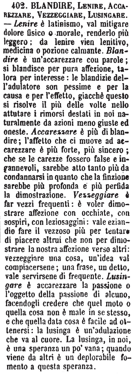 Adulare è sempre male, lusingare può esserlo, ma non sempre; l'accarezzare può avere un fine men buono; ma certo è dimostrazione di benevolenza. [immagine] |