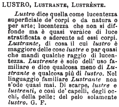 | Lustro, Lustrante, Lustrente - Lustro dice quella come lucentezza superficiale de' corpi o da natura o per arte; lucentezza che non si diffonde ma è quasi vernice di luce stratificata e aderente ad essi corpi. Lustrante, di cosa il cui lustro è maggiore delle cose lustre e par quasi che mandi qualche raggio di lucentezza. Lustrente è solo dell'uso familiare e dice qualcosa meno di Lustrante e qualcosa più di lustro. Nel linguaggio familiare Lustrante non s'ode quasi mai. Di scarpe, lustre e lustrenti, e così de' capelli, degli occhi, della pelle; del pelo solamente lustro. G. F. [immagine] |