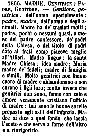 | Madre. Genitrice: Padre, Genitore - Genitore, genitrice, dell'uomo specialmente: padre, madre, dell'uomo e degli animali. Madre ha de' traslati molti; padre, pochi o nessuni quasi, a meno del padre confessore, de' padri della Chiesa, e del titolo di padri dato ai frati come piaceva meglio all'Alfieri. Madre lingua; la santa Madre Chiesa; idea madre; Maria madre de' fedeli; madre di famiglia e simili. Molte genitrici non hanno cuore di madre e abbandonano o non curano i figli loro; molte invece che genitrici non sono, fanno con zelo e amore veramente cristiano l'ufficio di madre: tali sono le buone sorelle preposte agli asili dell'infanzia. Madre si dice a quel fondo che lascia l'aceto e che serve a farne dell'altro e a rinvigorirlo. [immagine] |