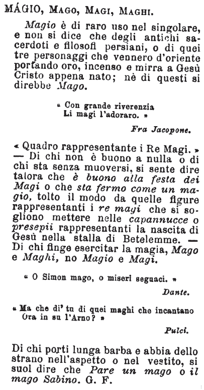 | Magio, Mago, Magi, Maghi - Magio è di raro uso nel singolare, e non si dice che degli antichi sacerdoti e filosofi persiani, o di quei tre personaggi che vennero d'oriente portando oro, incenso e mirra a Gesù Cristo appena nato; nè di questi si direbbe Mago.