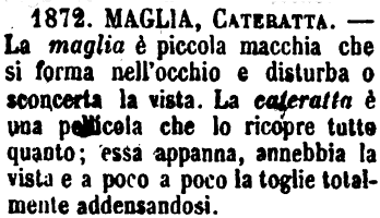 | Maglia, Cateratta - La maglia è piccola macchia che si forma nell'occhio e disturba o sconcerta la vista. La cateratta è una pellicola che lo ricopre tutto quanto; essa appanna, annebbia la vista e a poco a poco la toglie totalmente addensandosi. [immagine] |