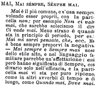| Mai, Mai Sempre, Sempre mai - Mai è il più comune, e s'usa sempre, volendo essere proprii, con la particella non; per esempio Non ci vado mai, che sarebbe solecismo il dire Ci vado mai. Meno strano è quando sta in principio di periodo, per es.: Mai mi sarei pensato, che, ecc. Ma è bene sempre preporvi la negativa. - Mai sempre e Sempre mai sono dello stile alto, e nel linguaggio familiare parrebbe un'affettazione: essi però hanno significato di Sempre, con divario solo nell'efficacia, e la particella mai vi sta per puro ripieno, come in altri avverbii di tempo e di luogo, come Quando mai, Dove mai. [immagine] |