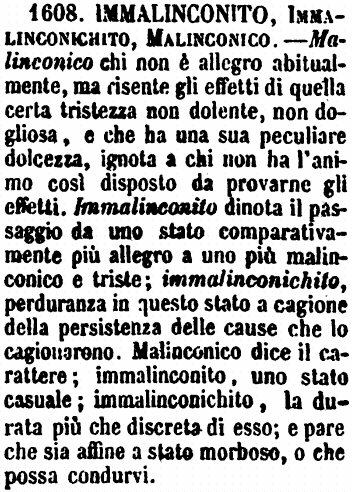 | Immalinconito, Immalinconichito, Malinconico - Malinconico chi non è allegro abitualmente, ma risente gli effetti di quella certa tristezza non dolente, non dogliosa, e che ha una sua peculiare dolcezza, ignota a chi non ha l'animo così disposto da provarne gli effetti. Immalinconito dinota il passaggio da uno stato comparativamente più allegro a uno più malinconico e triste; immalinconichito, perduranza in questo stato a cagione della persistenza delle cause che lo cagionarono. Malinconico dice il carattere; immalinconito, uno stato casuale; immalinconichito, la durata più che discreta di esso; e pare che sia affine a stato morboso, o che possa condurvi. [immagine] |