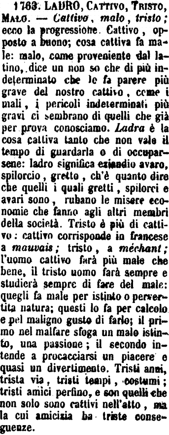 | Ladro, Cattivo, Tristo, Malo - Cattivo, malo, tristo; ecco la progressione. Cattivo, opposto a buono; cosa cattiva fa male: malo, come proveniente dal latino, dice un non so che di più indeterminato che lo fa parere più grave del nostro cattivo, come i mali, i pericoli indeterminati più gravi ci sembrano di quelli che già per prova conosciamo. Ladra è la cosa cattiva tanto che non vale il tempo di guardarla o di occuparsene: ladro significa eziandio avaro, spilorcio, gretto, ch'è quanto dire che quelli i quali gretti, spilorci e avari sono, rubano le misere economie che fanno agli altri membri della società. Tristo è più di cattivo: cattivo corrisponde in francese a mauvais; tristo, a méchant; l'uomo cattivo farà più male che bene, il tristo uomo farà sempre e studierà sempre di fare del male: quegli fa male per istinto o pervertita natura; questi lo fa per calcolo e pel maligno gusto di farlo; il primo nel malfare sfoga un malo istinto, una passione; il secondo intende a procacciarsi un piacere o quasi un divertimento. Tristi anni, trista via, tristi tempi, costumi; tristi amici perfino, e son quelli che non solo sono cattivi nell'atto, ma la cui amicizia ha triste conseguenze. [immagine] |