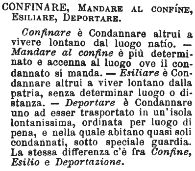| Confinare, Mandare al confine, Esiliare, Deportare - Confinare è Condannare altrui a vivere lontano dal luogo natio. - Mandare al confine è più determinato e accenna al luogo ove il condannato si manda. - Esiliare è Condannare altrui a viver lontano dalla patria, senza determinar luogo o distanza. - Deportare è Condannare uno ad esser trasportato in un'isola lontanissima, ordinata per luogo di pena, e nella quale abitano quasi soli condannati, sotto speciale guardia. La stessa differenza c'è fra Confine, Esilio e Deportazione. [immagine] |