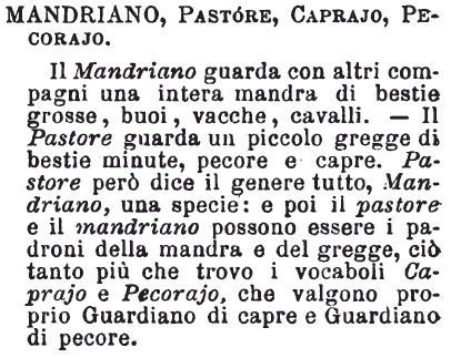 | Mandriano, Pastore, Capraio, Pecoraio - Il mandriano guarda con altri compagni un'intera mandra di bestie grosse, buoi, vacche, cavalli; il pastore guarda un piccolo gregge di bestie minute, pecore e capre: pastore però dice il genere tutto, mandriano, una specie: e poi il pastore e il mandriano possono essere i padroni della mandra e del gregge, ciò tanto più che trovo i vocaboli capraio e pecoraio, che valgono proprio, guardiano di capre e guardiano di pecore. [immagine] |