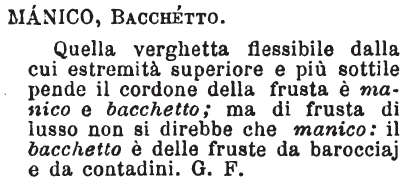 | Manico, Bacchetto - Quella verghetta flessibile dalla cui estremità superiore e più sottile pende il cordone della frusta è manico e bacchetto; ma di frusta di lusso non si direbbe che manico: il bacchetto è delle fruste da barocciaj e da contadini. G.F. [immagine] |