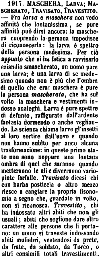 | Maschera, Larva, Mascherato, Travisato, Travestito - Fra larva e maschera non vedo affinità che lontanissima, se pure affinità può dirsi ancora: la maschera cuoprendo la persona impedisce di riconoscerla: la larva è spettro della persona medesima. Per ciò appunto che si ha fatica a ravvisarlo eziandio smascherato, un uomo pare una larva; è una larva di se medesimo quando non è più che l'ombra di quello che era: maschera è pure la persona mascherata, che ha sul volto la maschera e vestimenti indosso analoghi. Larva è pure spettro di defunto, raffigurato dall'ardente fantasia dormendo o anche vegliando. La scienza chiama larve gl'insetti al loro sortire dall'uovo e quando non hanno subìto per anco alcuna trasformazione: in questo primo stato non sono neppure una lontana ombra di quel che saranno quando metteranno le ali e diverranno variopinte farfalle. Travisato dicesi chi con barba posticcia o altro mezzo riesce a cangiare la propria fisonomia a segno che, guardato in volto, non si riconosca. Travestito, chi ha indossato altri abiti che non gli usuali; abiti che sogliono dare altro carattere alle persone che li portano: un uomo si traveste indossando abiti muliebri, vestendosi da prete, da frate, da soldato, da Turco, o altri consimili totali travestimenti. [immagine] |