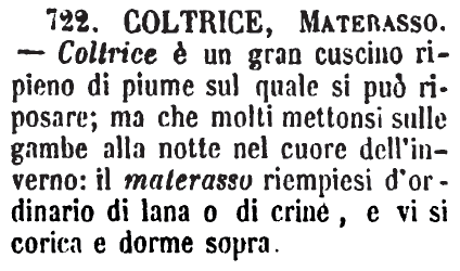 | Coltrice, Materasso - Coltrice è un gran cuscino ripieno di piume sul quale si può riposare; ma che molti mettonsi sulle gambe alla notte nel cuore dell'inverno: il materasso riempiesi d'ordinario di lana o di crine, e vi si corica e dorme sopra. [immagine] |