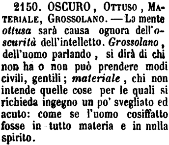 | Oscuro, Ottuso, Materiale, Grossolano - La mente ottusa sarà causa ognora dell'oscurità dell'intelletto. Grossolano, dell'uomo parlando, si dirà di chi non ha o non può prendere modi civili, gentili; materiale, chi non intende quelle cose per le quali si richieda ingegno un po' svegliato ed acuto: come se l'uomo cosiffatto fosse in tutto materia e in nulla spirito. [immagine] |
