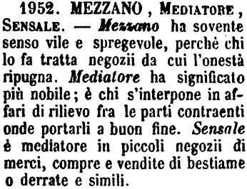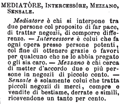 | Mezzano, Mediatore, Sensale - Mezzano ha sovente senso vile e spregevole, perchè chi lo fa tratta negozii da cui l'onestà ripugna. Mediatore ha significato più nobile; è chi s'interpone in affari di rilievo fra le parti contraenti onde portarli a buon fine. Sensale è mediatore in piccoli negozii di merci, compre e vendite di bestiame o derrate e simili. [immagine] |