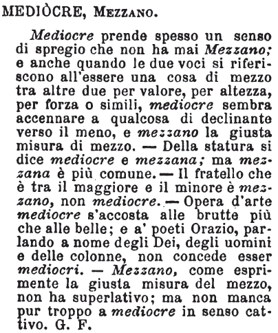 | Mezzano, Mediocre - Il primo si dice delle cose rispettivamente alla loro altezza fisica o altra qualunque loro elevazione; il secondo rispettivamente a ogni altra loro proprietà. Mezzana statura, età, altezza: mediocre ingegno, fortuna, lavoro: mediocre ha senso dispregiativo che mezzano non ha, perchè questo vuol dire propriamente ciò che sta naturalmente fra il più e il meno; mediocre si dice talora di cosa che per riguardo, convenienza o altro non si vuol tacciare assolutamente di brutta o cattiva. [immagine] |