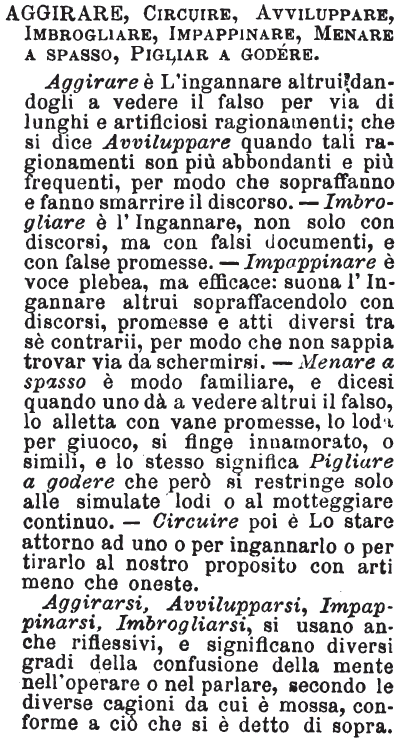 | Aggirare, Circuire, Avviluppare, Imbrogliare, Impappinare, Menare a spasso, Pigliar a godere - Aggirare è L'ingannare altrui, dandogli a vedere il falso per via di lunghi e artificiosi ragionamenti; che si dice Avviluppare quando tali ragionamenti son più abbondanti e più frequenti, per modo che sopraffanno e fanno smarrire il discorso. - Imbrogliare è l'Ingannare, non solo con discorsi, ma con falsi documenti, e con false promesse. - Impappinare è voce plebea, ma efficace: suona l'Ingannare altrui sopraffacendolo con discorsi, promesse e atti diversi tra sè contrarii, per modo che non sappia trovar via da schermirsi. - Menare a spasso è modo familiare, e dicesi quando uno dà a vedere altrui il falso, lo alletta con vane promesse, lo loda per giuoco, si finge innamorato, o simili, e lo stesso significa Pigliare a godere che però si restringe solo alle simulate lodi o al motteggiare continuo. - Circuire poi è Lo stare attorno ad uno o per ingannarlo o per tirarlo al nostro proposito con arti meno che oneste.