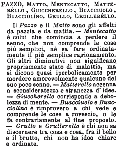 | Pazzo, Matto, Mentecatto, Matterello, Giuccherello, Buacciuolo, Buacciolino, Grullo, Grullerello - Il Pazzo e il Matto sono gli affetti da pazzia e da mattia. - Mentecatto è colui che comincia a perdere il senno, che non comprende le cose più semplici, nè sa fare ordinatamente il più semplice ragionamento. Gli altri diminutivi non significano propriamente stato di malattia, ma si dicono quasi iperbolicamente per mordere amorevolmente qualcuno del suo poco senno. - Matterello accenna a sconsideratezza e stranezza d'idee. - Giuccherello corrisponde a debolezza di mente. - Buacciuolo e Buacciolino è rimprovero a chi vede e comprende le cose a rovescio, o le fa contrariamente al fine proposto. - Grullo e Grullerello è chi non sa discernere tra cosa e cosa, tra il bello e il brutto, chi non ha idee chiare e ordinate. [immagine] |