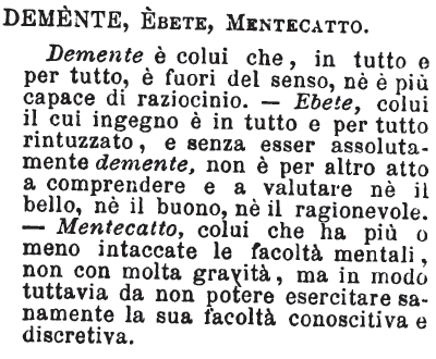 | Demente, Ebete, Mentecatto - Demente è colui che, in tutto e per tutto, è fuori del senso, nè è più capace di raziocinio. - Ebete, colui il cui ingegno è in tutto e per tutto rintuzzato, e senza esser assolutamente demente, non è per altro atto a comprendere e a valutare nè il bello, nè il buono, nè il ragionevole. - Mentecatto, colui che ha più o meno intaccate le facoltà mentali, non con molta gravità, ma in modo tuttavia da non potere esercitare sanamente la sua facoltà conoscitiva e discretiva. [immagine] |