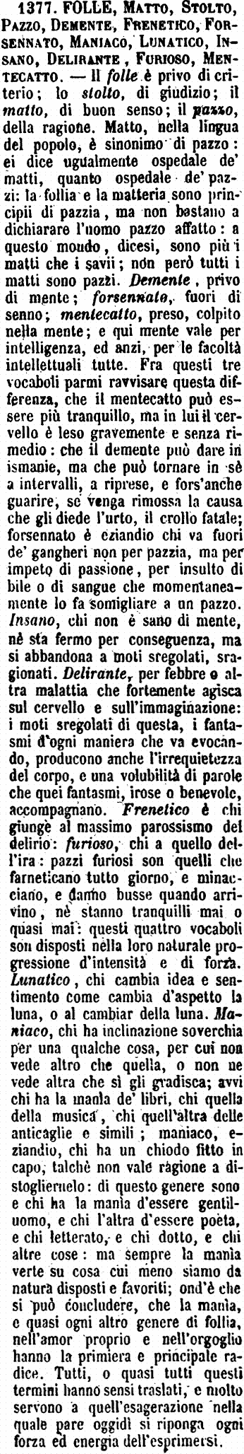 | Folle, Matto, Stolto, Pazzo, Demente, Frenetico, Forsennato, Maniaco, Lunatico, Insano, Delirante, Furioso, Mentecatto - Il folle è privo di criterio; lo stolto, di giudizio; il matto, di buon senso; il pazzo, della ragione. Matto, nella lingua del popolo, è sinonimo di pazzo: ei dice ugualmente ospedale de' matti, quanto ospedale de' pazzi: la follia e la matteria sono principii di pazzia, ma non bastano a dichiarare l'uomo pazzo affatto: a questo mondo, dicesi, sono più i matti che i savii; non però tutti i matti sono pazzi. Demente, privo di mente; forsennato, fuori di senno; mentecatto, preso, colpito nella mente; e qui mente vale per intelligenza, ed anzi, per le facoltà intellettuali tutte. Fra questi tre vocaboli parmi ravvisare questa differenza, che il mentecatto può essere più tranquillo, ma in lui il cervello è leso gravemente e senza rimedio: che il demente può dare in ismanie, ma che può tornare in sè a intervalli, a riprese, e fors'anche guarire, se venga rimossa la causa che gli diede l'urto, il crollo fatale; forsennato è eziandio chi va fuori de' gangheri non per pazzia, ma per impeto di passione, per insulto di bile o di sangue che momentaneamente lo fa somigliare a un pazzo: Insano, chi non è sano di mente, nè sta fermo per conseguenza, ma si abbandona a moti sregolati, sragionati. Delirante, per febbre o altra malattia che fortemente agisca sul cervello e sull'immaginazione: i moti sregolati di questa, i fantasmi d'ogni maniera che va evocando, producono anche l'irrequietezza del corpo, e una volubilità di parole che quei fantasmi, irose o benevole, accompagnano, Frenetico è chi giunge al massimo parossismo del delirio: furioso, chi a quello dell'ira: pazzi furiosi son quelli che farneticano tutto giorno, e minacciano, e danno busse quando arrivino, nè stanno tranquilli mai o quasi mai: questi quattro vocaboli son disposti nella loro naturale progressione d'intensità e di forza. Lunatico, chi cambia idea e sentimento come cambia d'aspetto la luna, o al cambiar della luna. Maniaco, chi ha inclinazione soverchia per una qualche cosa, per cui non vede altro che quella, o non ne vede altra che sì gli gradisca; avvi chi ha la manìa de' libri, chi quella della musica, chi quell'altra delle anticaglie e simili; maniaco, eziandio, chi ha un chiodo fitto in capo, talchè non vale ragione a distorgliernelo: di questo genere sono e chi ha la manìa d'essere gentiluomo, e chi l'altra d'essere poeta, e chi letterato, e chi dotto, e chi altre cose: ma sempre la manìa verte su cosa cui meno siamo da natura disposti e favoriti; ond'è che si può concludere, che la manìa, e quasi ogni altro genere di follia, nell'amor proprio e nell'orgoglio hanno la primiera e principale radice. Tutti, o quasi tutti questi termini hanno sensi traslati, e molto servono a quell'esagerazione nella quale pare oggidì si riponga ogni forza ed energia nell'esprimersi. [immagine] |
