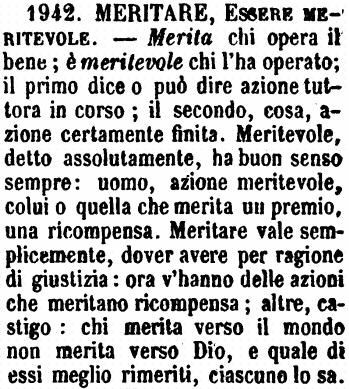 | Meritare, Essere Meritevole - Merita chi opera il bene; è meritevole chi l'ha operato; il primo dice o può dire azione tuttora in corso; il secondo, cosa, azione certamente finita. Meritevole, detto assolutamente, ha buon senso sempre: uomo, azione meritevole, colui o quella che merita un premio, una ricompensa. Meritare vale semplicemente, dover avere per ragione di giustizia: ora v'hanno delle azioni che meritano ricompensa; altre, castigo: chi merita verso il mondo non merita verso Dio, e quale di essi meglio rimeriti, ciascuno lo sa. [immagine] |